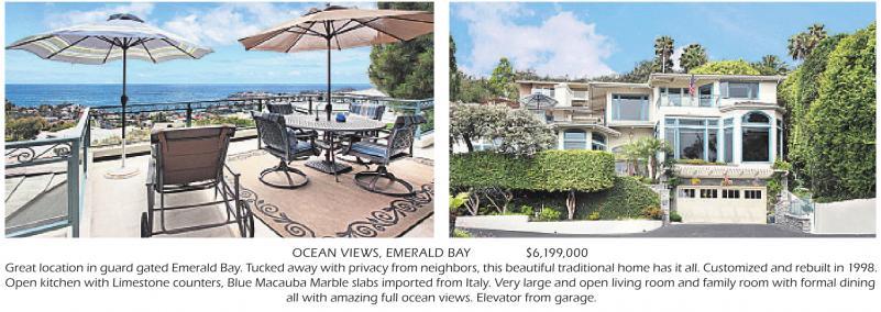 OCEAN VIEWS, EMERALD BAY $6,199,000 Great location in guard gated Emerald Bay. Tucked away with privacy from neighbors, this beautiful traditional home has it all. Customized and rebuilt in 1998. Open kitchen with Limestone counters, Blue Macauba Marble slabs imported from Italy. Very large and open living room and family room with formal dining all with amazing full ocean views. Elevator from garage.