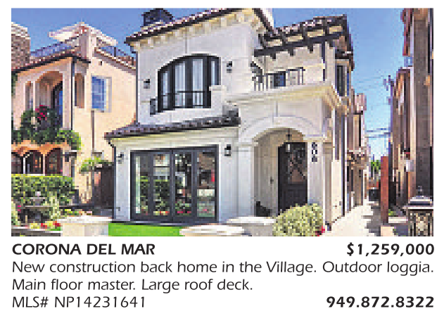 CORONA DEL MAR $1,259,000 New construction back home in the Village. Outdoor loggia. Main floor master. Large roof deck. MLS# NP14231641 949.872.8322