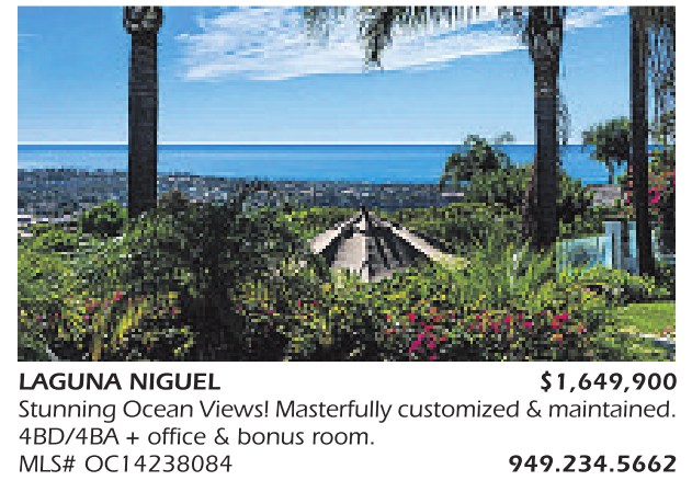 LAGUNA NIGUEL $1,649,900 Stunning Ocean Views! Masterfully customized &maintained. 4BD/4BA + office & bonus room. MLS# OC14238084 949.234.5662