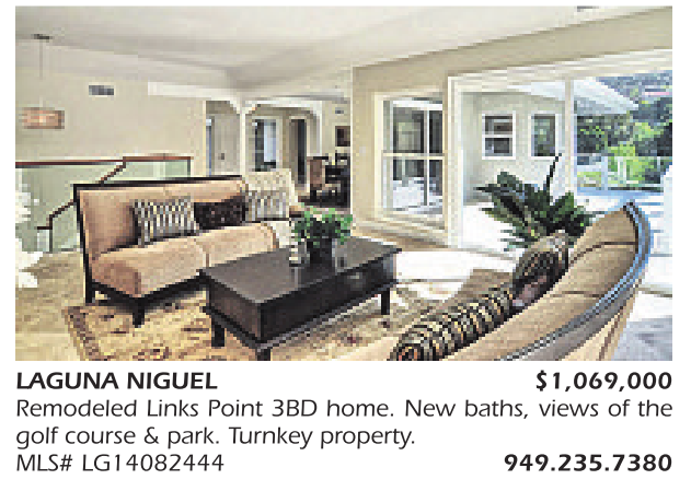 LAGUNA NIGUEL $1,069,000 Remodeled Links Point 3BD home. New baths, views of the golf course & park. Turnkey property. MLS# LG14082444 949.235.7380