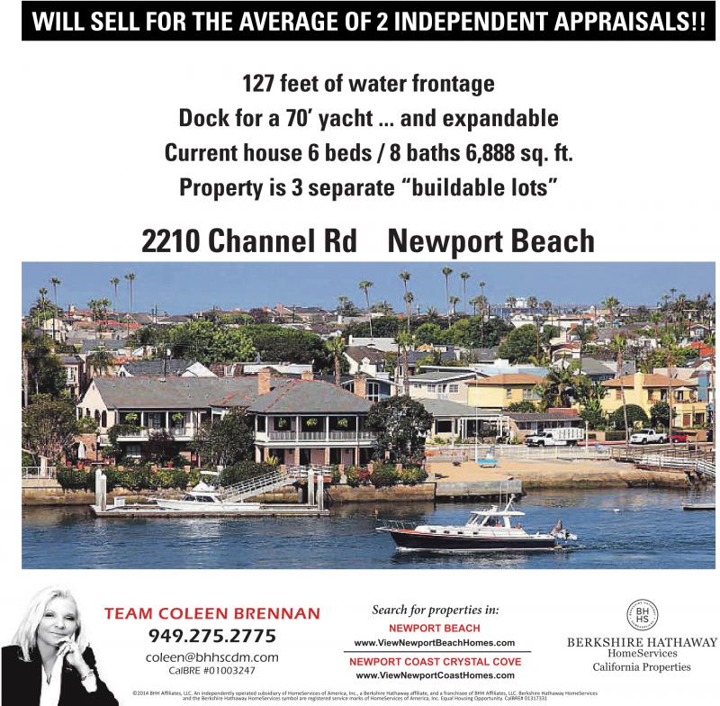 WILL SELL FOR THE AVERAGE OF 2 INDEPENDENT APPRAISALS!! 127 feet of water frontage Dock for a 70’ yacht ... and expandable Current house 6 beds / 8 baths 6,888 sq. ft. Property is 3 separate “buildable lots” 2210 Channel Rd Newport Beach TEAM COLEEN BRENNAN 949.275.2775 coleen@bhhscdm.com CalBRE #01003247 Search for properties in: NEWPORT BEACH www.ViewNewportBeachHomes.com NEWPORT COAST CRYSTAL COVE www.ViewNewportCoastHomes.com
