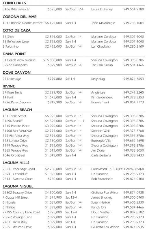 chino hiLLs 3466 Whirlaway Ln $525,000 Sat/Sun 12-4 Laura D. Farley 949.554.9180 corona deL Mar 1011 Bonnie Doone Terrace $6,195,000 Sun 1-4 John McMonigle 949.735.1004 coto de caza 16 Shire $2,849,000 Sat/Sun 1-4 Mariann Cordova 949.307.4040 18 Reflection Lane $2,525,000 Sun 1-4 Mariann Cordova 949.307.4040 8 Palomino $2,495,000 Sat/Sun 1-4 Lyn Chadwick 949.280.2109 dana point 31 Beach View Avenue $15,000,000 Sun 1-4 Shauna Covington 949.395.8786 32972 Danapalm $829,900 Sat/Sun 1-4 The Ora Group 949.584.4466 doVe canyon 24 Lakeridge $799,800 Sat 1-4 Kelly Klug 949.874.7653 irVine 27 Rose Trellis $2,299,950 Sat/Sun 1-4 Angie Lee 949.241.3245 14 Faith $1,675,000 Sun 1-4 Kim Seidenberg 949.378.5353 4996 Paseo Segovia $819,900 Sat/Sun 1-4 Bonnie Trent 949.854.7173 Laguna Beach 154 Thalia Street $6,995,000 Sat/Sun 1-4 Shauna Covington 949.395.8786 31696 Seacliff $4,595,000 Sat/Sun 1 – 4 Shauna Covington 949.395.8786 1315 Pitcairn Place $3,995,000 Sat/Sun 1-4 Shauna Covington 949.395.8786 31508 Mar Vista Ave $2,795,000 Sat/Sun 1-4 Spencer Wall 949.375.7768 599 Alta Vista Way $2,395,000 Sat/Sun 1-4 Shauna Covington 949.395.8786 618 Loretta Drive $2,150,000 Sat/Sun 1-4 Eustorgio Villa 949.632.1698 1499 Terrace Way $1,599,000 Sat/Sun 1-4 Shauna Covington 949.395.8786 1385 Terrace Way $1,619,000 Sat/Sun 1-4 Jim Doria 949.933.8050 1046 Oro Street $1,349,000 Sun 1-4 Carla Bertaina 949.338.9433 Laguna hiLLs 25231 Rockridge Road $2,750,000 Sat/Sun 1-4 Colen/Vahdat 610.308.9633/949.682.9090 25941 Cedarbluff $1,325,000 Sun 1-4 Liz Hansche 949.295.9373 25131 Natama Court $750,000 Sun 1-4 Bob Strausheim 949.874.0300 Laguna nigueL 22802 Seaway Drive $4,500,000 Sun 1-4 Giulietta Fox Wilson 949.874.0935 4 Copps Hill Street $1,649,900 Sat 12-4 James Shockey 949.300.0900 6 Nicosia $1,539,000 Sat/Sun 1-4 Susan Helton 949.606.2330 5 Phillips $1,399,000 Sat/Sun 1-4 Randy Ora 949.584.4466 27795 Country Lane Road $925,000 Sat 12-4 Doug Wathen 949.887.8282 23862 Voyager Lane $899,000 Sun 1-4 Liz Hansche 949.295.9373 27831 Trellis Way $899,000 Sat 1-4 Liz Hansche 949.295.9373 25651 Weston Drive $829,000 Sun 1-4 Giulietta Fox Wilson 949.874.0935