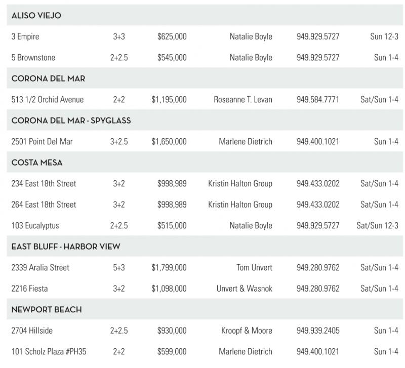 ALISO VIEJO 3Empire 3+3 $625,000 Natalie Boyle 949.929.5727 Sun 12-3 5Brownstone 2+2.5 $545,000 Natalie Boyle 949.929.5727 Sun 1-4 CORONA DELMAR 513 1/2 Orchid Avenue 2+2 $1,195,000 Roseanne T. Levan 949.584.7771 Sat/Sun 1-4 CORONA DELMAR -SPYG SS 2501 Point Del Mar 3+2.5 $1,650,000 Marlene Dietrich 949.400.1021 Sun 1-4 COSTAMESA 234 East 18th Street 3+2 $998,989 Kristin Halton Group 949.433.0202 Sat/Sun 1-4 264 East 18th Street 3+2 $998,989 Kristin Halton Group 949.433.0202 Sat/Sun 1-4 103 Eucalyptus 2+2.5 $515,000 Natalie Boyle 949.929.5727 Sat/Sun 12-3 EASTBLUFF -HARBOR VIEW 2339 Aralia Street 5+3 $1,799,000 TomUnvert 949.280.9762 Sat/Sun 1-4 2216 Fiesta 3+2 $1,098,000 Unvert &Wasnok 949.280.9762 Sat/Sun 1-4 NEWPORTBEACH 2704 Hillside 2+2.5 $930,000 Kroopf &Moore 949.939.2405 Sun 1-4 101 Scholz Plaza #PH35 2+2 $599,000 Marlene Dietrich 949.400.1021 Sun 1-4 See also