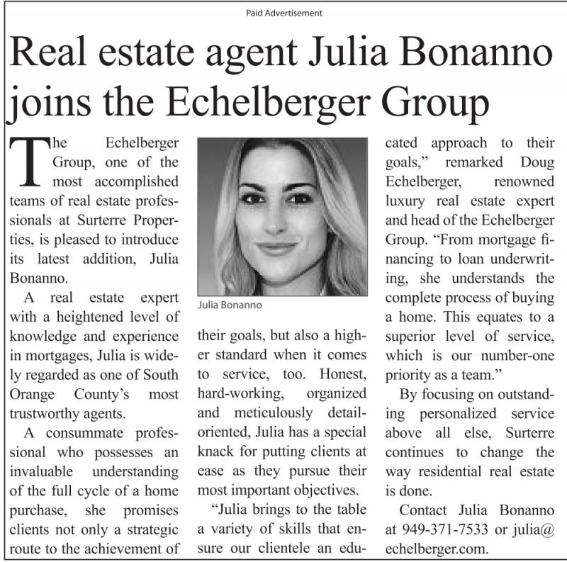 Echelberger Group, one of the most accomplished teams of real estate professionals at Surterre Properties, is pleased to introduce its latest addition, Julia Bonanno.