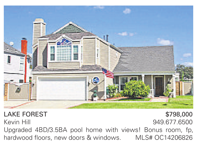 LAKE FOREST $798,000 Kevin Hill 949.677.6500 Upgraded 4BD/3.5BA pool home with views! Bonus room, fp, hardwood floors, new doors & windows. MLS# OC14206826