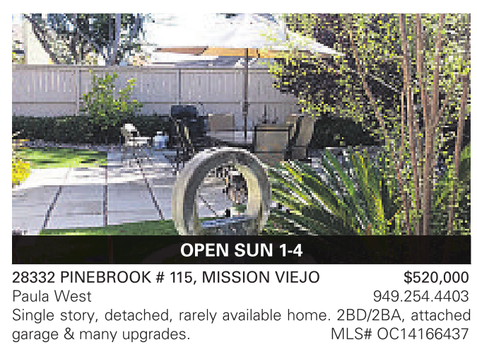 28332 PINEBROOK # 115, MISSION VIEJO $520,000 Paula West 949.254.4403 Single story, detached, rarely available home. 2BD/2BA, attached garage & many upgrades. MLS# OC14166437