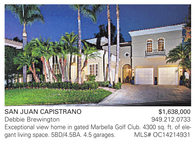 SAN JUAN CAPISTRANO $1,638,000 Debbie Brewington 949.212.0733 Exceptional view home in gated Marbella Golf Club. 4300 sq. ft. of elegant living space. 5BD/4.5BA. 4.5 garages. MLS# OC14214931