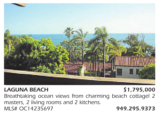 LAGUNA BEACH $1,795,000 Breathtaking ocean views from charming beach cottage! 2 masters, 2 living rooms and 2 kitchens. MLS# OC14235697 949.295.9373