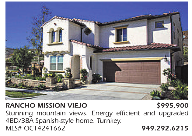 RANCHO MISSION VIEJO $995,900 Stunning mountain views. Energy efficient and upgraded 4BD/3BA Spanish-style home. Turnkey. MLS# OC14241662 949.292.6215
