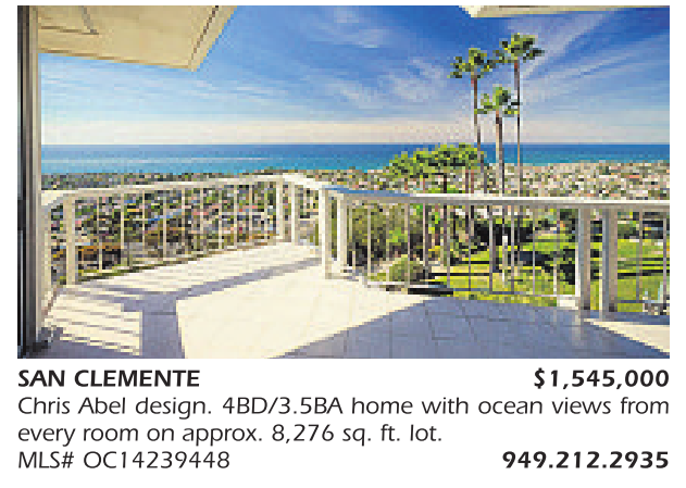 SAN CLEMENTE $1,545,000 Chris Abel design. 4BD/3.5BA home with ocean views from every room on approx. 8,276 sq. ft. lot. MLS# OC14239448 949.212.2935