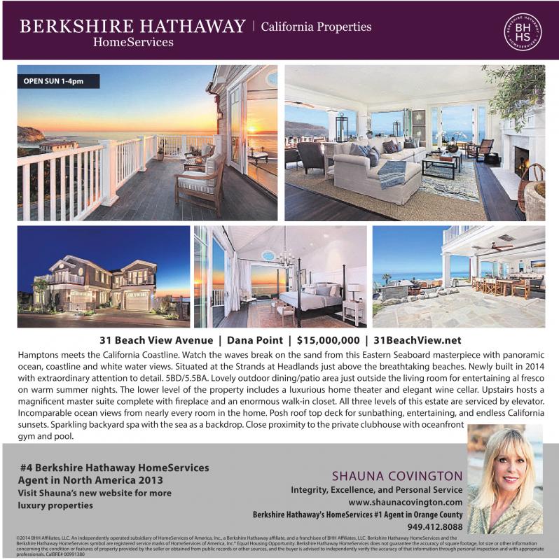 OPEN SUN 1-4pm 31 Beach View Avenue | Dana Point | $15,000,000 | 31BeachView.net Hamptons meets the California Coastline. Watch the waves break on the sand from this Eastern Seaboard masterpiece with panoramic ocean, coastline and white water views. Situated at the Strands at Headlands just above the breathtaking beaches. Newly built in 2014 with extraordinary attention to detail. 5BD/5.5BA. Lovely outdoor dining/patio area just outside the living room for entertaining al fresco on warm summer nights. The lower level of the property includes a luxurious home theater and elegant wine cellar. Upstairs hosts a magnificent master suite complete with fireplace and an enormous walk-in closet. All three levels of this estate are serviced by elevator. Incomparable ocean views from nearly every room in the home. Posh roof top deck for sunbathing, entertaining, and endless California sunsets. Sparkling backyard spa with the sea as a backdrop. Close proximity to the private clubhouse with oceanfront gym and pool. #4 Berkshire Hathaway HomeServices Agent in North America 2013 Visit Shauna’s new website for more luxury properties SHAUNA COVINGTON Integrity, Excellence, and Personal Service www.shaunacovington.com Berkshire Hathaway's HomeServices #1 Agent in Orange County 949.412.8088 ©2014 BHH Affiliates,LLC.Anindependently operatedsubsidiaryofHomeServices of America, Inc.,aBerkshireHathawayaffiliate, andafranchisee of BHH Affiliates,LLC.BerkshireHathawayHomeServices and the BerkshireHathawayHomeServices symbol areregistered servicemarks of HomeServices of America, Inc.®Equal Housing Opportunity. BerkshireHathawayHomeServices does not guarantee the accuracyofsquarefootage,lot sizeorotherinformation concerning the condition or features of property provided by the seller or obtained from public recordsorother sources, and the buyer is advised to independently verify the accuracyofthatinformation through personalinspection and with appropriate professionals.CalBRE# 00991380