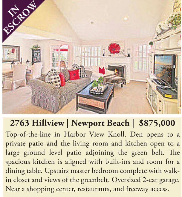 2763 Hillview | Newport Beach | $875,000 Top-of-the-line in Harbor View Knoll. Den opens to a private patio and the living room and kitchen open to a large ground level patio adjoining the green belt. The spacious kitchen is aligned with built-ins and room for a dining table. Upstairs master bedroom complete with walkin closet and views of the greenbelt. Oversized 2-car garage.
