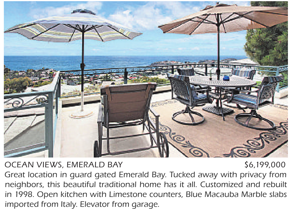 OCEAN VIEWS, EMERALD BAY $6,199,000 Great location in guard gated Emerald Bay. Tucked away with privacy from neighbors, this beautiful traditional home has it all. Customized and rebuilt in 1998. Open kitchen with Limestone counters, Blue Macauba Marble slabs imported from Italy. Elevator from garage.