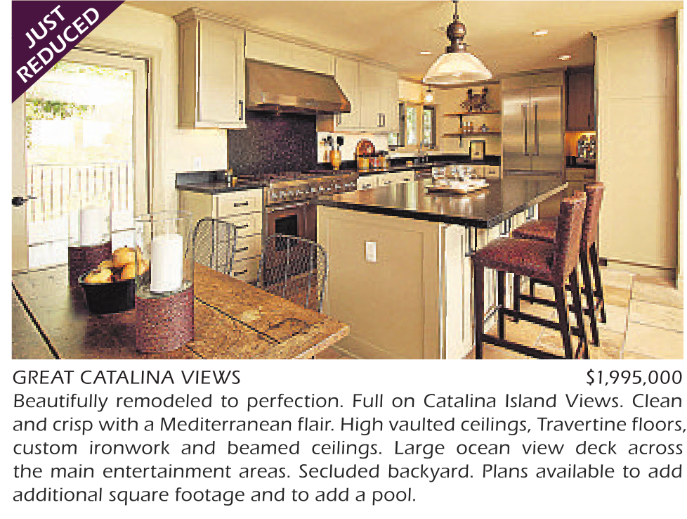 GREAT CATALINA VIEWS $1,995,000 Beautifully remodeled to perfection. Full on Catalina Island Views. Clean and crisp with a Mediterranean flair. High vaulted ceilings, Travertine floors, custom ironwork and beamed ceilings. Large ocean view deck across the main entertainment areas. Secluded backyard. Plans available to add additional square footage and to add a pool.