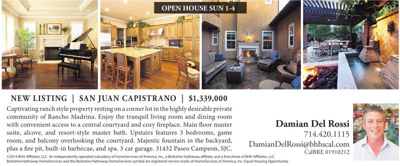 OPEN HOUSE SUN 1-4 NEW LISTING | SAN JUAN CAPISTRANO | $1,339,000 Captivatingranch style property restingonacornerlot in thehighlydesirableprivate community of Rancho Madrina. Enjoy the tranquil living room and dining room with convenient access to a central courtyard and cozy fireplace. Main floor master suite, alcove, and resort-style master bath. Upstairs features 3 bedrooms, game room, and balcony overlooking the courtyard. Majestic fountain in the backyard, plus a fire pit, built-in barbecue, and spa. 3 car garage. 31432 Paseo Campeon, SJC. ©2014 BHH Affiliates,LLC.Anindependently operated subsidiaryofHomeServices of America, Inc.,aBerkshireHathawayaffiliate, andafranchisee of BHH Affiliates,LLC. BerkshireHathaway HomeServices and the BerkshireHathawayHomeServices symbol areregistered servicemarks of HomeServices of America, Inc. EqualHousing Opportunity. Damian Del Rossi 714.420.1115 DamianDelRossi@bhhscal.com CalBRE 01910212