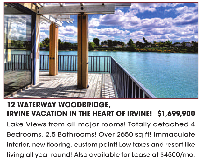 12 WATERWAY WOODBRIDGE, IRVINE VACATION IN THE HEART OF IRVINE! $1,699,900 Lake Views from all major rooms! Totally detached 4Bedrooms, 2.5 Bathrooms! Over 2650 sq ft! Immaculate interior, new flooring, custom paint!Low taxesand resort like living all year round! Also available for Lease at $4500/mo.