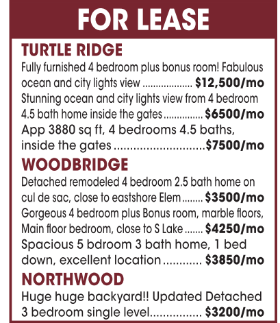 TURTLE RIDGE FOR LEASE Fully furnished 4bedroom plus bonus room! Fabulous ocean and city lights view ................... $12,500/mo Stunning ocean and city lights view from 4bedroom 4.5 bath home inside the gates ............... $6500/mo App 3880 sq ft, 4bedrooms 4.5 baths, inside the gates............................$7500/mo WOODBRIDGE Detached remodeled 4bedroom 2.5 bath home on cul desac, close to eastshore Elem........ $3500/mo Gorgeous 4bedroom plus Bonus room, marble floors, Main floor bedroom, close toSLake....... $4250/mo Spacious 5bdroom 3bath home, 1bed down, excellent location............ $3850/mo NORTHWOOD Huge huge backyard!! Updated Detached 3bedroom single level................ $3200/mo