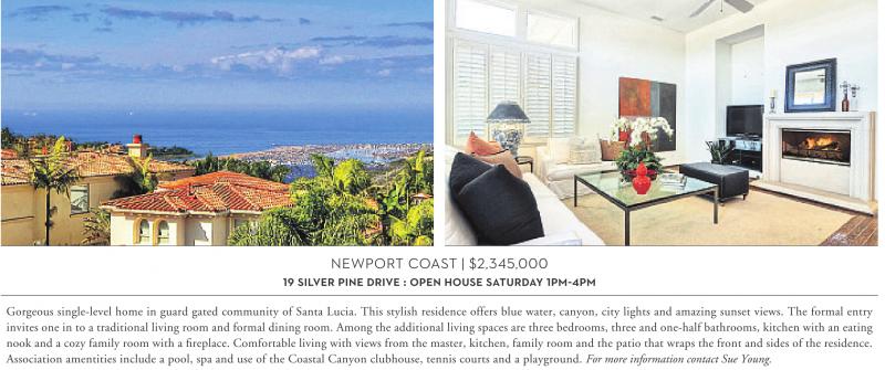 NEWPORT COAST | $2,345,000 19 SILVER PINE DRIVE : OPEN HOUSE SATURDAY 1PM-4PM Gorgeous single-level home in guard gated community of Santa Lucia. This stylish residence offers blue water, canyon, city lights and amazing sunset views. The formal entry invites one in to a traditional living room and formal dining room. Among the additional living spaces are three bedrooms, three and one-half bathrooms, kitchen with an eating nook and a cozy family room with a fireplace. Comfortable living with views from the master, kitchen, family room and the patio that wraps the front and sides of the residence. Association amentities include a pool, spa and use of the Coastal Canyon clubhouse, tennis courts and a playground. For more information contact Sue Young.