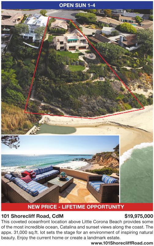101 Shorecliff Road, CdM $19,975,000 This coveted oceanfront location above Little Corona Beach provides some of the most incredible ocean, Catalina and sunset views along the coast. The appx. 31,000 sq.ft. lot sets the stage for an environment of inspiring natural beauty. Enjoy the current home or create a landmark estate.