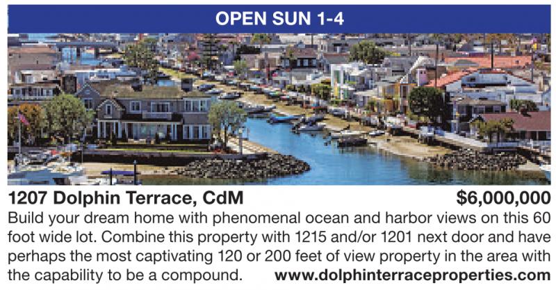 1207 Dolphin Terrace, CdM $6,000,000 Build your dream home with phenomenal ocean and harbor views on this 60 foot wide lot. Combine this property with 1215 and/or 1201 next door and have perhaps the most captivating 120 or 200 feet of view property in the area with the capability to be a compound. www.dolphinterraceproperties.com
