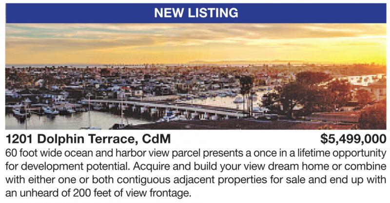 NEW LISTING 1201 Dolphin Terrace, CdM $5,499,000 60 foot wide ocean and harbor viewparcel presents aonceinalifetime opportunity for development potential. Acquire and build your view dream home or combine with either one or both contiguous adjacent properties for sale and end up with an unheard of 200 feet of view frontage.