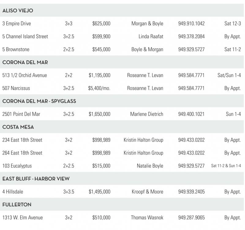 3EmpireDrive 3+3 $625,000 Morgan &Boyle 949.910.1042 Sat 12-3 5Channel Island Street 3+2.5 $599,900 Linda Raafat 949.378.2084 By Appt. 5Brownstone 2+2.5 $545,000 Boyle &Morgan 949.929.5727 Sat 11-2 CORONA DELMAR 513 1/2 Orchid Avenue 2+2 $1,195,000 Roseanne T. Levan 949.584.7771 Sat/Sun 1-4 507 Narcissus 3+2.5 $5,400/mo. Roseanne T. Levan 949.584.7771 By Appt. CORONA DELMAR -SPYG SS 2501 Point Del Mar 3+2.5 $1,650,000 Marlene Dietrich 949.400.1021 Sun 1-4 COSTAMESA 234 East 18th Street 3+2 $998,989 Kristin Halton Group 949.433.0202 By Appt. 264 East 18th Street 3+2 $998,989 Kristin Halton Group 949.433.0202 By Appt. 103 Eucalyptus 2+2.5 $515,000 Natalie Boyle 949.929.5727 Sat 11-2 &Sun 1-4 EASTBLUFF -HARBOR VIEW 4Hillsdale 3+3.5 $1,495,000 Kroopf &Moore 949.939.2405 By Appt. FULLERTON 1313 W. Elm Avenue 3+2 $510,000 Thomas Wasnok 949.287.9065 By Appt.