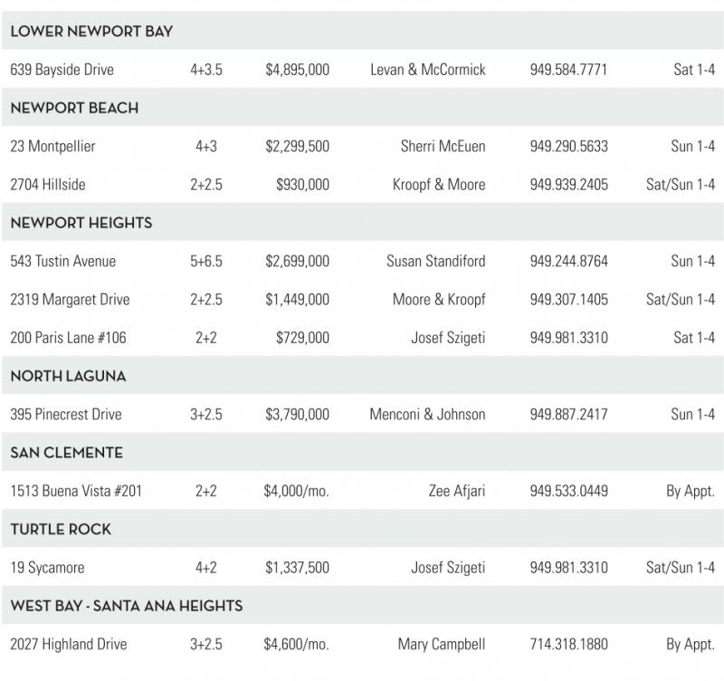 LOWER NEWPORTBAY 639 Bayside Drive 4+3.5 $4,895,000 Levan &McCormick 949.584.7771 Sat 1-4 NEWPORTBEACH 23 Montpellier 4+3 $2,299,500 Sherri McEuen 949.290.5633 Sun 1-4 2704 Hillside 2+2.5 $930,000 Kroopf &Moore 949.939.2405 Sat/Sun 1-4 NEWPORTHEIGHTS 543 Tustin Avenue 5+6.5 $2,699,000 Susan Standiford 949.244.8764 Sun 1-4 2319 Margaret Drive 2+2.5 $1,449,000 Moore &Kroopf 949.307.1405 Sat/Sun 1-4 200 Paris Lane #106 2+2 $729,000 Josef Szigeti 949.981.3310 Sat 1-4 NORTH GUNA 395 Pinecrest Drive 3+2.5 $3,790,000 Menconi &Johnson 949.887.2417 Sun 1-4 SANCLEMENTE 1513 Buena Vista #201 2+2 $4,000/mo. Zee Afjari 949.533.0449 By Appt. TURTLE ROCK 19 Sycamore 4+2 $1,337,500 Josef Szigeti 949.981.3310 Sat/Sun 1-4 WESTBAY -SANTAANA HEIGHTS 2027 Highland Drive 3+2.5 $4,600/mo. Mary Campbell 714.318.1880 By Appt.