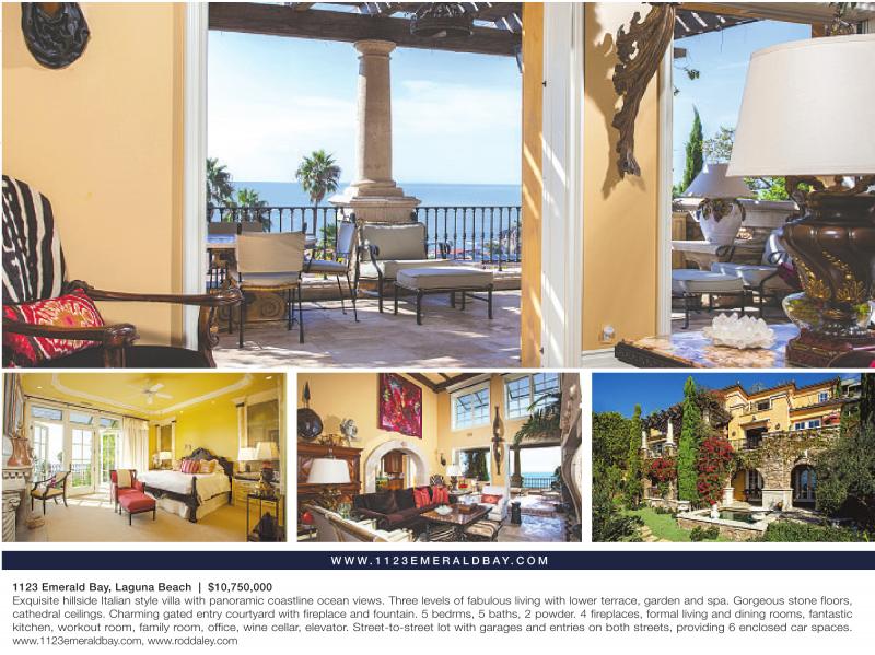 1123 Emerald Bay, Laguna Beach | $10,750,000 Exquisite hillside Italian style villa with panoramic coastline ocean views. Three levels of fabulous living with lower terrace, garden and spa. Gorgeous stone floors, cathedral ceilings. Charming gated entry courtyard with fireplace and fountain. 5 bedrms, 5 baths, 2 powder. 4 fireplaces, formal living and dining rooms, fantastic kitchen, workout room, family room, office, wine cellar, elevator. Street-to-street lot with garages and entries on both streets, providing 6 enclosed car spaces. www.1123emeraldbay.com, www.roddaley.com