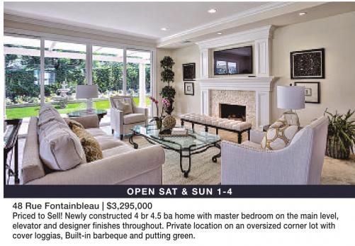 48 Rue Fontainbleau | $3,295,000 OPEN SAT & SUN 1-4 Priced to Sell! Newly constructed 4 br 4.5 ba home with master bedroom on the main level, elevator and designer finishes throughout. Private location on an oversized corner lot with cover loggias, Built-in barbeque and putting green.