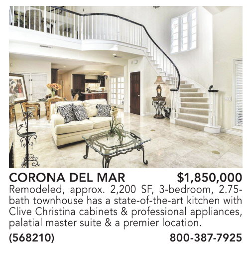 CORONA DEL MAR $1,850,000 Remodeled, approx. 2,200 SF, 3-bedroom, 2.75- bath townhouse has a state-of-the-art kitchen with Clive Christina cabinets & professional appliances, palatial master suite & a premier location. (568210) 800-387-7925