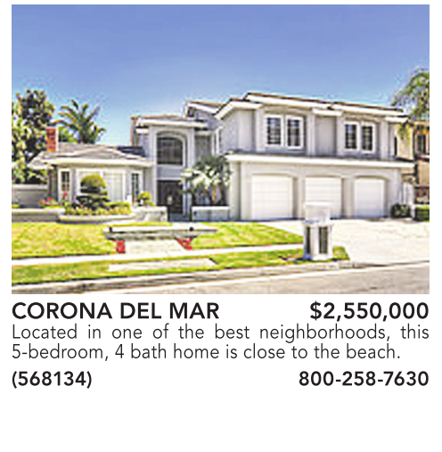 CORONA DEL MAR $2,550,000 Located in one of the best neighborhoods, this 5-bedroom, 4 bath home is close to the beach. (568134) 800-258-7630