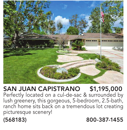 SAN JUAN CAPISTRANO $1,195,000 Perfectly located on a cul-de-sac & surrounded by lush greenery, this gorgeous, 5-bedroom, 2.5-bath, ranch home sits back on a tremendous lot creating picturesque scenery! (568183) 800-387-1455