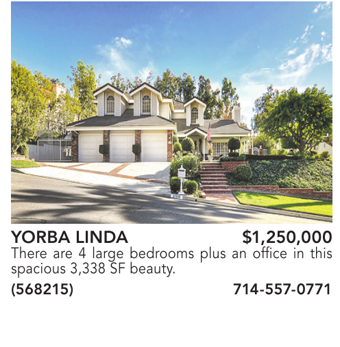 YORBA LINDA $1,250,000 There are 4 large bedrooms plus an office in this spacious 3,338 SF beauty. (568215) 714-557-0771