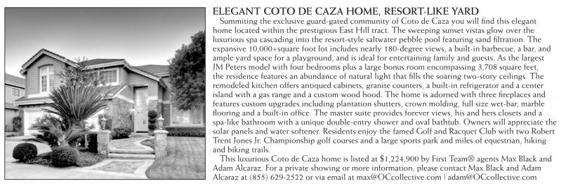This luxurious Coto de Caza home is listed at $1,224,900 by First Team® agents Max Black and Adam Alcaraz. For a private showing or more information, please contact Max Black and Adam Alcaraz at (855) 629-2522 or via email at max@OCcollective.com | adam@OCcollective.com