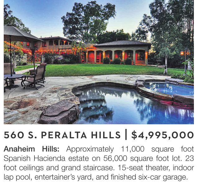 Anaheim Hills: Approximately 11,000 square foot Spanish Hacienda estate on 56,000 square foot lot. 23 foot ceilings and grand staircase. 15-seat theater, indoor lap pool, entertainer’s yard, and finished six-car garage.