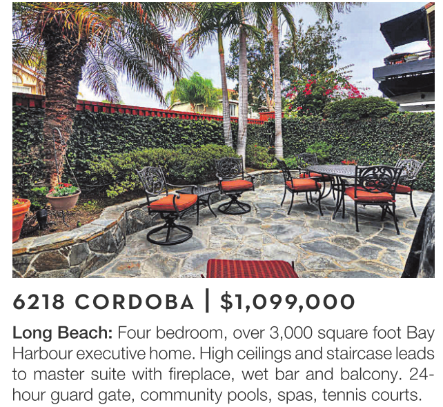 Long Beach: Four bedroom, over 3,000 square foot Bay Harbour executive home. High ceilings and staircase leads to master suite with fireplace, wet bar and balcony. 24- hour guard gate, community pools, spas, tennis courts.