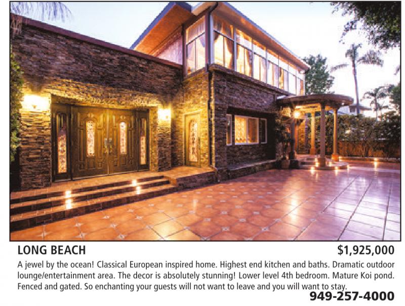 LONG BEACH $1,925,000 A jewel by the ocean! Classical European inspired home. Highest end kitchen and baths. Dramatic outdoor lounge/entertainment area. The decor is absolutely stunning! Lower level 4th bedroom. Mature Koi pond. Fenced andgated. So enchantingyourguestswillnot want to leave andyou will want to stay. 949-257-4000