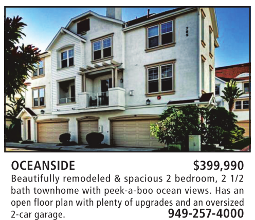 bath townhome with peek-a-boo ocean views. Has an open floor plan with plenty ofupgrades and anoversized 2-car garage. 949-257-4000
