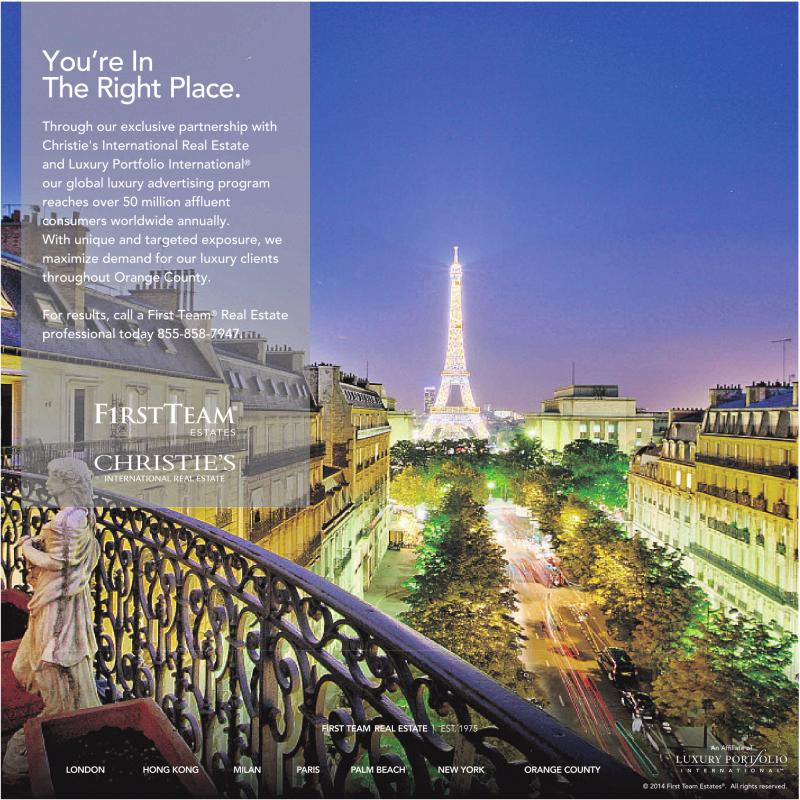 You’re In The Right Place. Through our exclusive partnership with Christie's International Real Estate and Luxury Portfolio International ® our global luxury advertising program reaches over 50 million affluent consumers worldwide annually. With unique and targeted exposure, we maximize demand for our luxury clients throughout Orange County. For results, call a First Team ® Real Estate professional today 855-858-7947. FIRST TEAM REAL ESTATE | EST.1975 An Affiliate of LONDON HONG KONG MILAN PARIS PALM BEACH NEW YORK ORANGE COUNTY ©2014 First Team Estates ® . All rights reserved. ©2014 First Team Estates ® . All rights reserved.