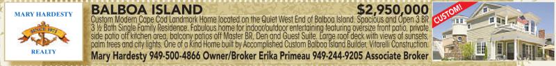MARY HARDESTY REALTY BALBOA ISLAND $2,950,000 B Custom Modern Cape Cod Landmark Home located on the on the Quiet West End of Balboa Island. Spacious and Open 3 BR 3½Bath Single Family Residence.Fabulous home forindoor/outdoor entertainingfeaturing oversizefront patio,privateprivate side patio off kitchen area, balcony patios off Master BR, Den and Guest Suite. Large roof deck with views of sunsets, ppalm trees andcitylights. OneofaKindHome builtbyAccomplishedCustomBalboa IslandBuilder,Vitarelli Construction. Mary Hardesty 949-500-4866 Owner/Broker Erika Primeau 949-244-9205 Associate Broker