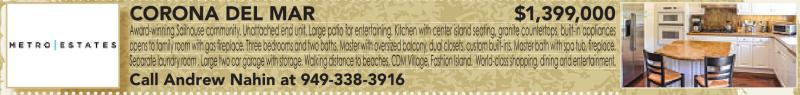 CORONA DEL MAR $1,399,000 C Aw Award-winning Sailhouse community. Unattached end unit. Large patio for entertaining. Kitchen with center island seating, granite countertops, built-in appliances openstofamilyroomwith gas fireplace.Three bedrooms andtwo baths. Master with oversized balcony, dual closets,custombuilt-ins.Master bath with spatub,fireplace. Separate laundry room .Large twocar garage with storage. Walkingdistancetobeaches, CDMVillage,FashionIsland. World-class shopping,diningand entertainment. Se C Call Andrew Nahin at 949-338-3916