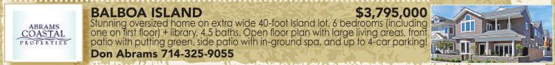 BALBOA ISLAND $3,795,000 Stunning oversized home on extra wide 40-foot Island lot. 6 bedrooms (including one on first floor) + library, 4.5 baths. Open floor plan with large living areas, front patio with putting green, side patio with in-ground spa, and up to 4-car parking! Don Abrams 714-325-9055