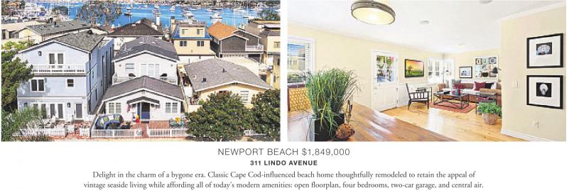 NEWPORT BEACH $1,849,000 311 LINDO AVENUE Delight in the charm of a bygone era. Classic Cape Cod-influenced beach home thoughtfully remodeled to retain the appeal of vintage seaside living while affording all of today's modern amenities: open floorplan, four bedrooms, two-car garage, and central air.