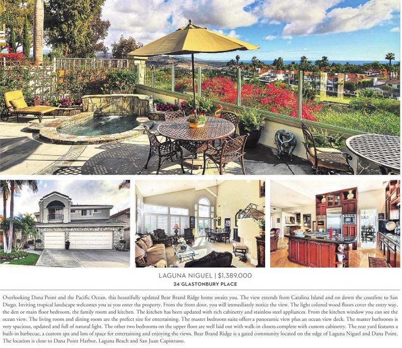 LAGUNA NIGUEL | $1,389,000 24 GLASTONBURY PLACE Overlooking Dana Point and the Pacific Ocean, this beautifully updated Bear Brand Ridge home awaits you. The view extends from Catalina Island and on down the coastline to San Diego. Inviting tropical landscape welcomes you as you enter the property. From the front door, you will immediately notice the view. The light colored wood floors cover the entry way, the den or main floor bedroom, the family room and kitchen. The kitchen has been updated with rich cabinetry and stainless steel appliances. From the kitchen window you can see the ocean view. The living room and dining room are the prefect size for entertaining. The master bedroom suite offers a panoramic view plus an ocean view deck. The master bathroom is very spacious, updated and full of natural light. The other two bedrooms on the upper floor are well laid out with walk-in closets complete with custom cabinetry. The rear yard features a built-in barbecue, a custom spa and lots of space for entertaining and enjoying the views. Bear Brand Ridge is a gated community located on the edge of Laguna Niguel and Dana Point. The location is close to Dana Point Harbor, Laguna Beach and San Juan Capistrano.