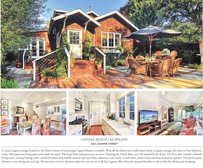 LAGUNA BEACH | $2,495,000 344 JASMINE STREET A classic Laguna cottage located on the Flower Streets of picturesque Laguna Beach is available. With all the charm you would expect from a Laguna cottage, this three or four bedroom home offers generous living space and ample out space. The large front yard greets you as arrive. Opening the Dutch door, you will amazed by the decor. The floor plan includes a formal living room, a formal dining room, updated kitchen with marble counter tops and white cabinetry, a sun room, a mud room, media room and three bedrooms upstairs. The private patio features a cozy sitting area and spa. The location on lower Jasmine makes for easy access to all that Laguna offers from the postcard beaches to the world class dining and shopping.