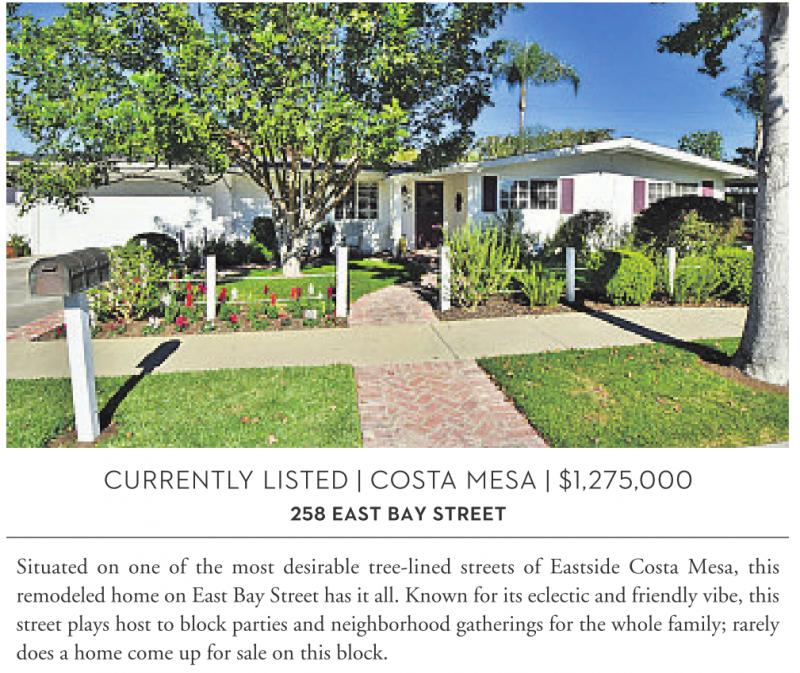 CURRENTLY LISTED | COSTA MESA | $1,275,000 258 EAST BAY STREET Situated on one of the most desirable tree-lined streets of Eastside Costa Mesa, this remodeled home on East Bay Street has it all. Known for its eclectic and friendly vibe, this street plays host to block parties and neighborhood gatherings for the whole family; rarely does a home come up for sale on this block.