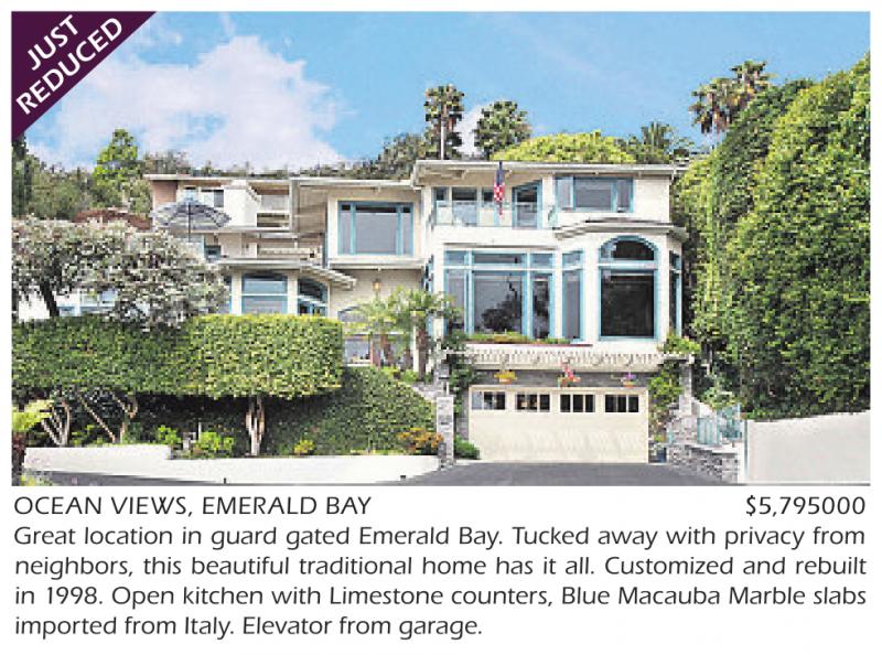 OCEAN VIEWS, EMERALD BAY $5,795000 Great location in guard gated Emerald Bay. Tucked away with privacy from neighbors, this beautiful traditional home has it all. Customized and rebuilt in 1998. Open kitchen with Limestone counters, Blue Macauba Marble slabs imported from Italy. Elevator from garage.