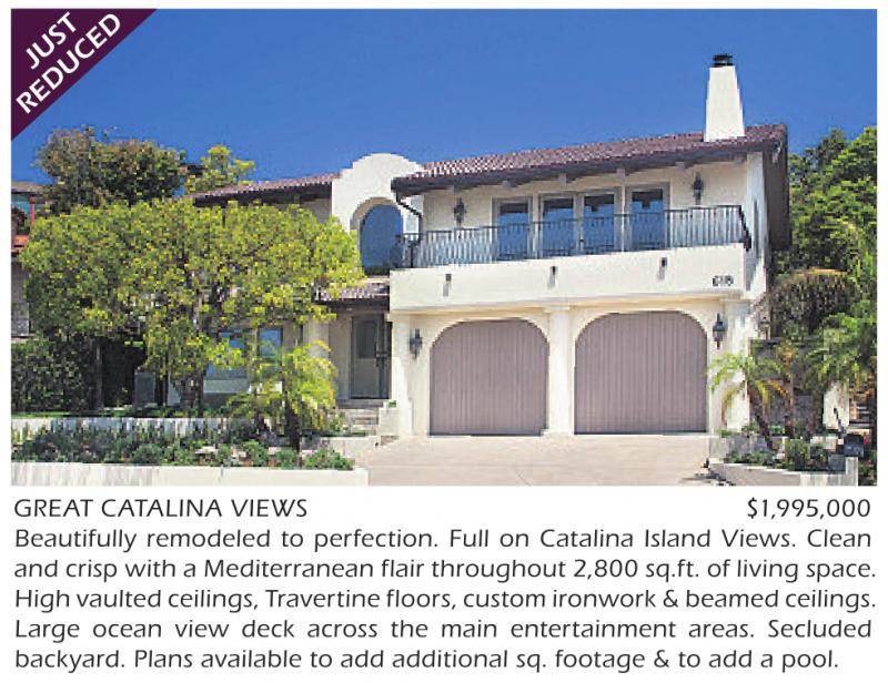 GREAT CATALINA VIEWS $1,995,000 Beautifully remodeled to perfection. Full on Catalina Island Views. Clean and crisp with a Mediterranean flair throughout 2,800 sq.ft. of living space. High vaulted ceilings, Travertine floors, custom ironwork & beamed ceilings. Large ocean view deck across the main entertainment areas. Secluded backyard. Plans available to add additional sq. footage & to add a pool.