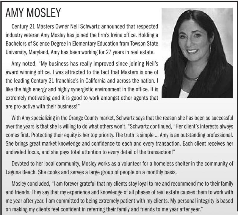 AMY MOSLEY Century 21 Masters Owner Neil Schwartz announced that respected industry veteran Amy Mosley has joined the firm’s Irvine office. Holding a BachelorsofScience Degree in ElementaryEducation fromTowsonState University, Maryland, Amy has been working for 27 years in real estate. Amy noted, “My business has really improved since joining Neil’s award winning office. I was attracted to the fact that Masters is one of the leading Century 21 franchise’s in California and across the nation. I like the high energy and highly synergistic environment in the office. It is extremely motivating and it is good to work amongst other agents that are pro-active with their business!” With Amyspecializinginthe OrangeCountymarket, Schwartzsaysthatthe reason shehas been so successful overthe yearsisthatshe is willingtodowhatotherswon’t.“Schwartz continued, “Herclient’s interests always comesfirst. Protectingtheir equity is hertop priority.The truth is simple …Amy is an outstandingprofessional. She brings great market knowledge and confidence to each and every transaction. Each client receives her undivided focus, and she pays total attention to every detail of the transaction!” Devoted to her local community, Mosley works as a volunteer for a homeless shelter in the community of Laguna Beach. She cooks and serves a large group of people on a monthly basis. Mosley concluded, “I am forever gratefulthatmyclientsstayloyaltomeand recommendmetotheir family andfriends.Theysay that my experience andknowledge of allphasesofrealestate causes them to work with me year after year.Iamcommittedtobeing extremelypatient with my clients. My personal integrity is based on making my clients feel confident in referring their family and friends to me year after year.”