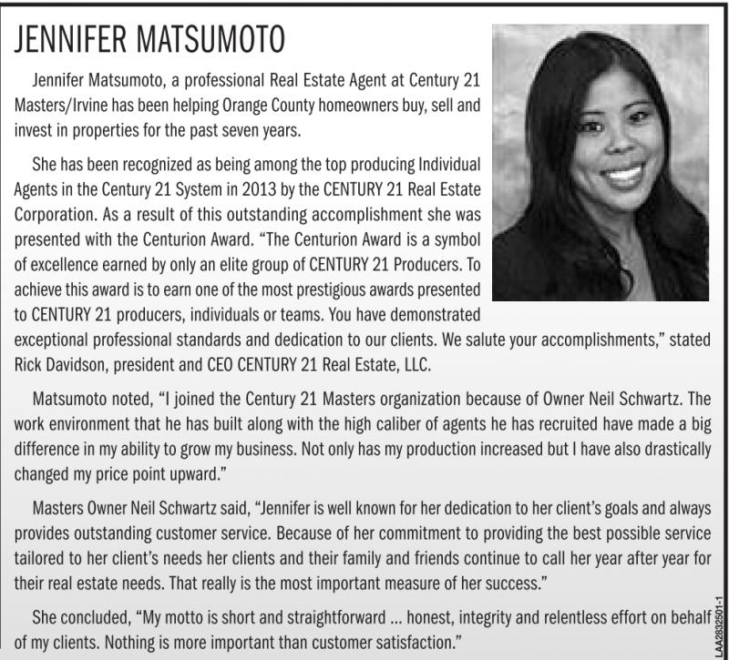 JENNIFER MATSUMOTO Jennifer Matsumoto, a professional Real Estate Agent at Century 21 Masters/Irvine hasbeenhelping OrangeCountyhomeownersbuy,selland invest in properties for the past seven years. Shehas been recognizedasbeing among thetop producing Individual Agentsinthe Century 21 System in 2013 by theCENTURY 21 Real Estate Corporation. As a result of this outstanding accomplishment she was presented with the Centurion Award. “The Centurion Award is a symbol of excellence earned by only an elite group of CENTURY 21 Producers. To achieve this awardistoearnone of themostprestigious awardspresented to CENTURY 21 producers, individuals or teams. You have demonstrated exceptional professional standards and dedication to our clients. We salute your accomplishments,” stated Rick Davidson, president and CEO CENTURY 21 Real Estate, LLC. Matsumoto noted, “I joined the Century 21 Masters organization because of Owner Neil Schwartz. The work environment that he has built along with the high caliber of agents he has recruited have made a big difference in my ability to growmybusiness. Not only hasmyproduction increasedbut Ihave also drastically changed my price point upward.” MastersOwner Neil Schwartz said, “Jenniferiswellknown forher dedication to herclient’s goalsand always provides outstanding customer service. Because of her commitment to providing the best possible service tailored to her client’s needs her clients and their family and friends continue to call her year after year for their real estate needs. That really is the most important measure of her success.” Sheconcluded, “Mymotto is shortand straightforward…honest,integrity andrelentless effort on behalf of my clients. Nothing is more important than customer satisfaction.”